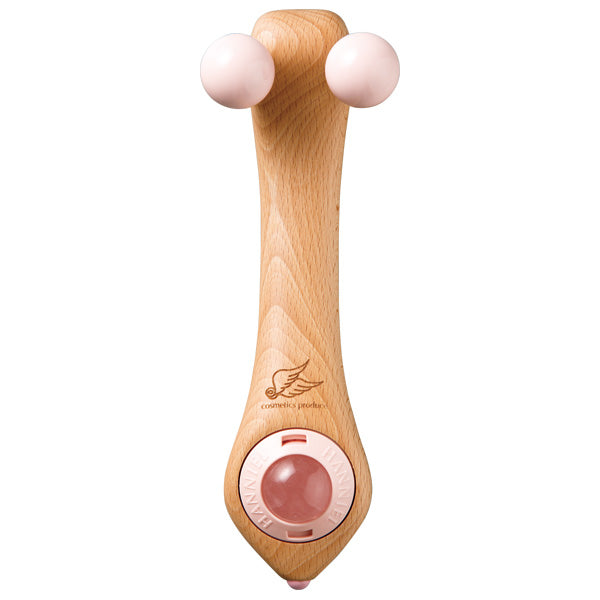 磁石とネガティブイオンと遠赤外線を放出するルビーパウダーから出来ている2つのマッサージボールの装着角度が細かく計算されており、力を入れなくても心地良い“つまみ感”でお顔のマッサージが出来ます。お顔だけではなく、脚・背中への使用や、天然石(ローズクウォーツ)部分にてデコルテへ使用、マッサージボールと同じ素材で製造した先端に付いている小さなボールで、全身のツボ押しが出来る、多機能な美顔器です。ブナの木を使用している本体は、職人が1本1本手作りしている、こだわりの逸品です。