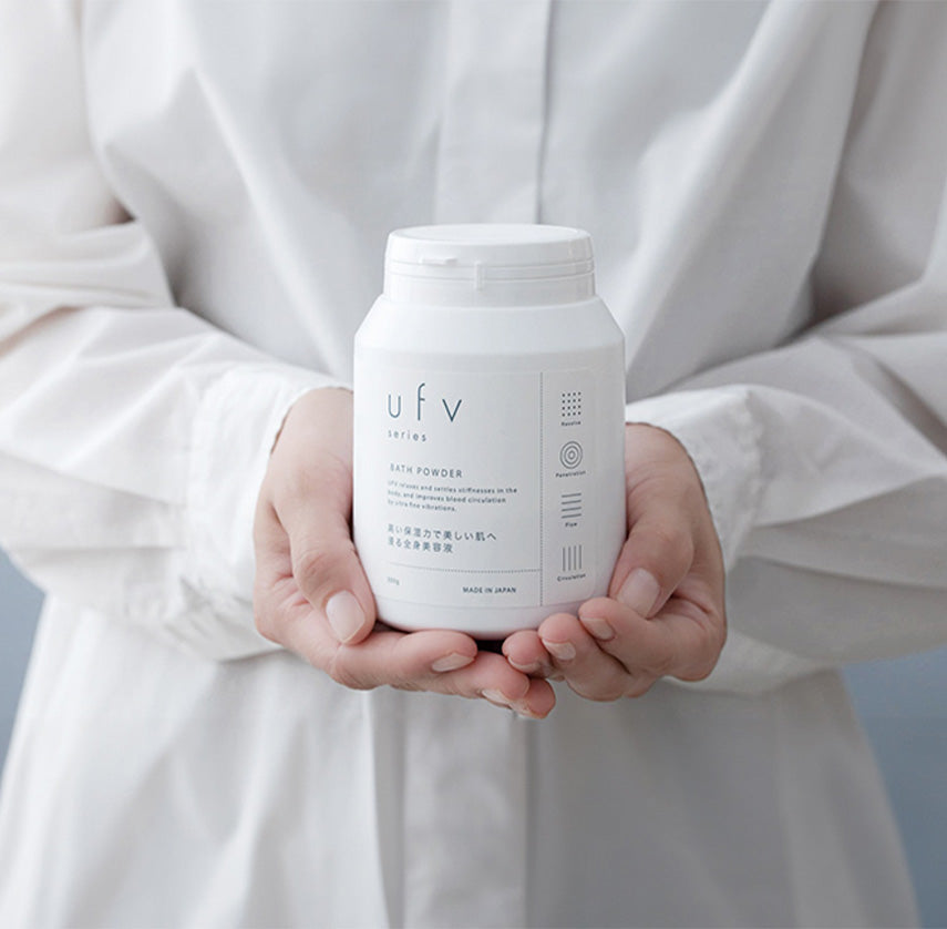 人は美を育む健康的な周波数を持っている。その考え方をもとに、天然美容成分のみを配合したバスパウダーにufv加工を施しました。